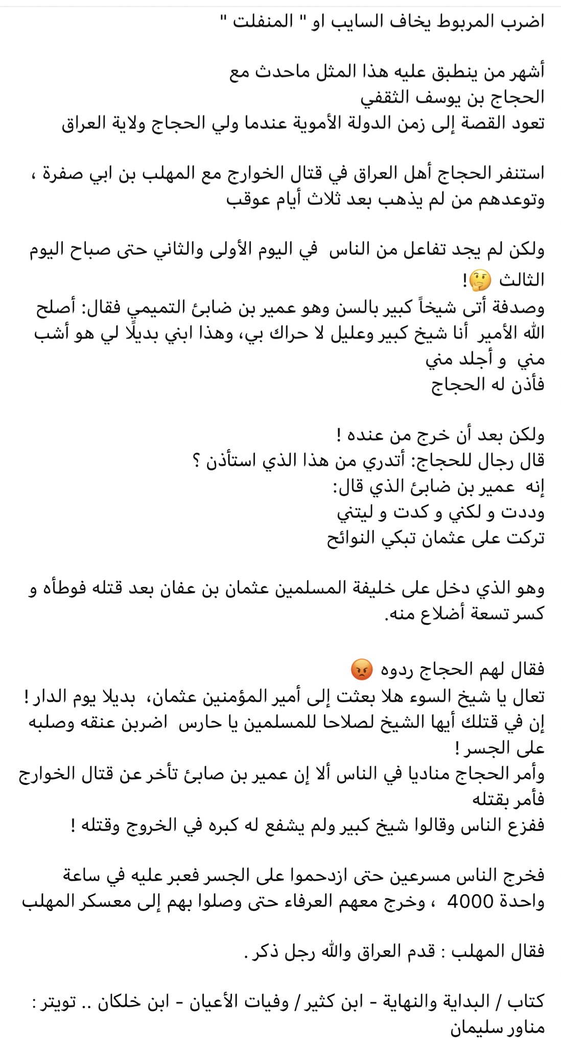 مناور سليمان Sur Twitter اضرب المربوط يخاف السايب او المنفلت هو مثل عامي يعني أن يبدي الإنسان سيطرته لما تحت يده ليخشاه من ليس تحت سيطرته أشهر من